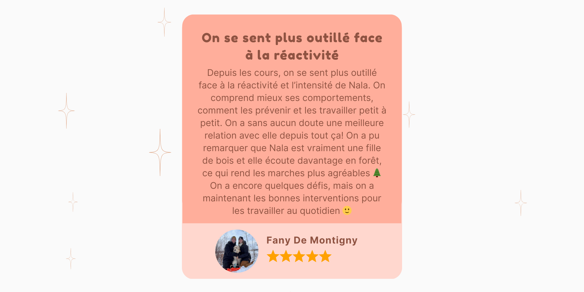 👉 Si tes difficultés concernent principalement les commandements, je te dirigerai plutôt vers les cours d’obéissance, qui sont mieux adaptés à ce type de besoin.